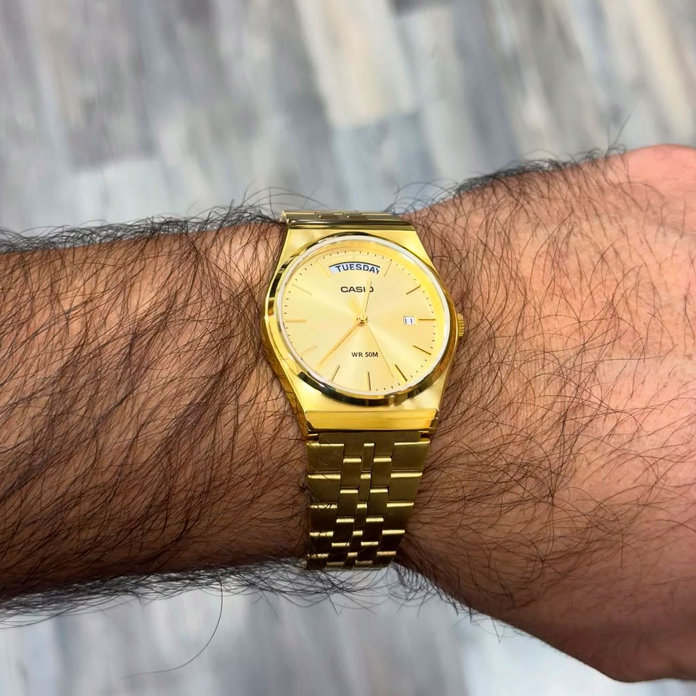 Standard. Мужские часы. Циферблат с метками в виде штрихов выполнен по технологии Sunray (солнечные лучи). Окошко даты находится в положении 3 часа. Окошко дня недели находится в положении 12 часов. Батарея рассчитана на 3 года. Браслет с тройной раскладывающейся застежкой, расстегиваемой одним касанием. Модель выполнена в винтажном корпусе "плоской бочки", который получил всемирную популярность в конце 1970-х годов, имеет аутентичный браслет с мелкими звеньями дополняющий образ и яркий визуальный акцент на текущем дне недели, — такого вы не встретите у других собратьев по классической коллекции Casio. Также на борту: небольшая влагозащита от дождя или брызг, прочное минеральное стекло, батарея сроком службы до 3 лет и точность хода в ±20 секунд в месяц.
