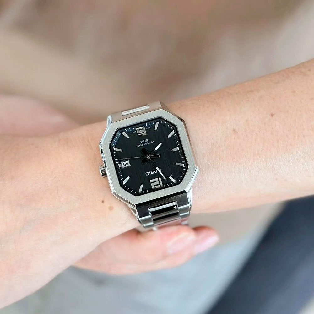 Мужские часы Casio MTP-B195D-1A — это классическая модель для повседневного и делового стиля, сочетающая лаконичный дизайн и проверенное японское качество. Часы подойдут тем, кто ищет универсальный аксессуар для офиса и повседневной носки. Модель оснащена кварцевым механизмом Casio калибра 5664, обеспечивающим точный и стабильный ход. На циферблате отображается текущая дата, что делает часы практичными для ежедневного использования. Корпус и браслет выполнены из нержавеющей стали, благодаря чему часы отличаются прочностью и устойчивостью к износу. Чёрный циферблат защищён минеральным стеклом, а стрелки покрыты люминесцентным напылением, позволяющим легко считывать время в условиях слабого освещения. Размер корпуса 38 x 46.5 x 8.3 мм (Ш x В xТ) делает модель аккуратной и комфортной на запястье. Водонепроницаемость 50 метров (5 АТМ/bar): выдерживают мытье рук, попадание крупных капель.