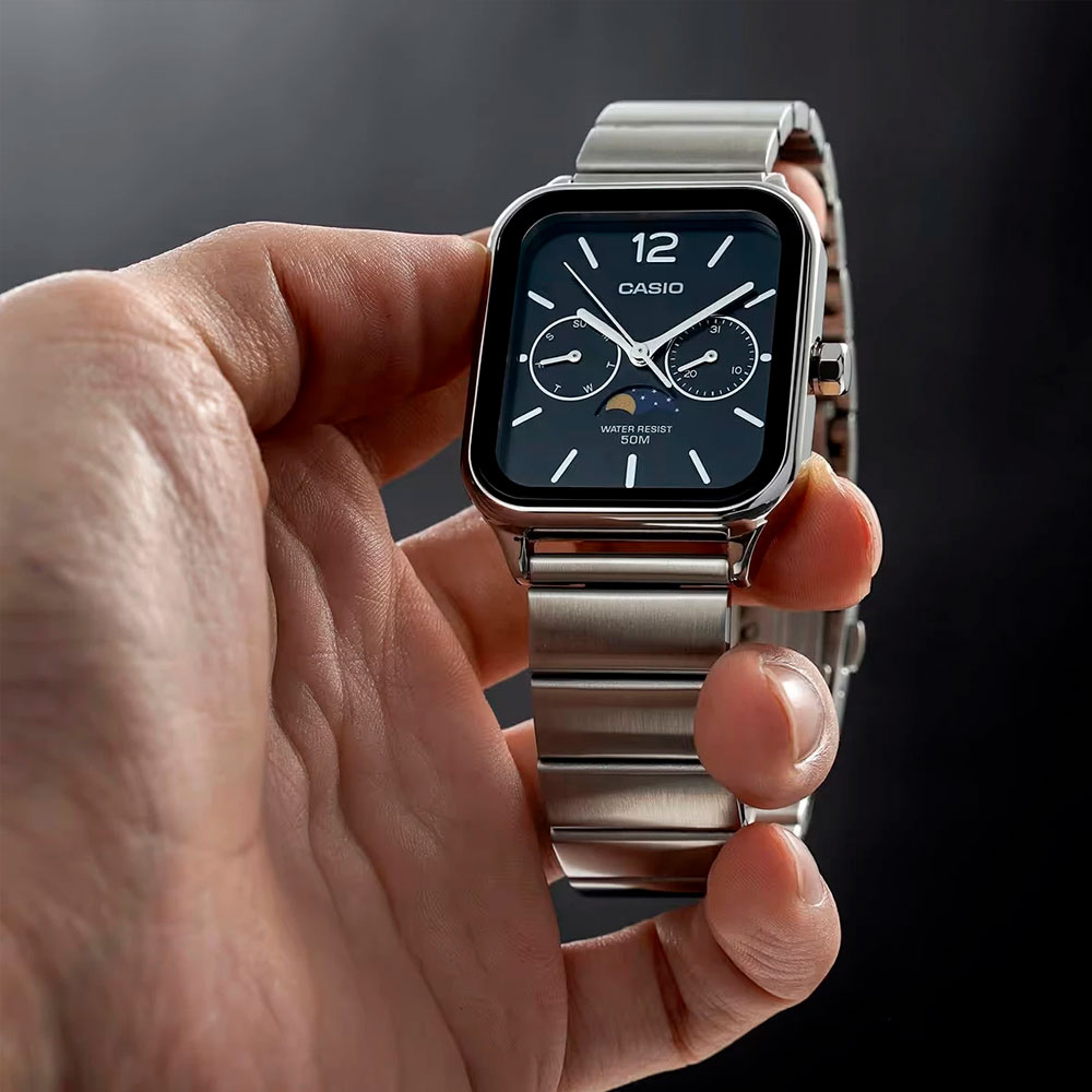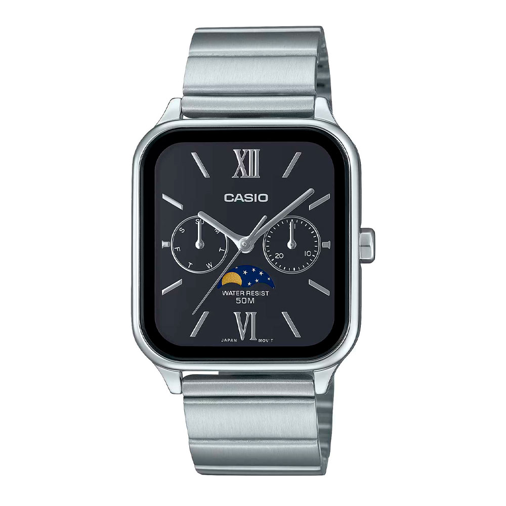 Стильные часы от Casio несомненно найдут поклонников среди ценителей надежных и практичных аксессуаров. Standard. Мужские часы. Циферблат с метками в виде штрихов и двух римских цифр. Число и день недели вынесены на отдельные циферблаты. Отображение фаз Луны. Батарейка рассчитана на 3 года. Браслет с тройной раскладывающейся застежкой, расстегиваемой одним касанием.