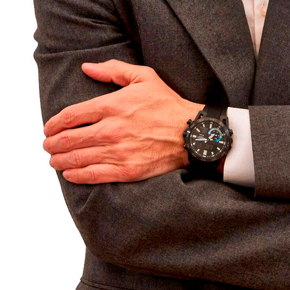 Стильная и функциональная новинка в линейке Edifice пронизана насквозь спортом и духом скорости. Edifice Sospensione. Мужские часы, дизайн которых вдохновлен подвеской болида Формулы-1. Ушки часов разработаны по схеме четырехрычажной подвески гоночного автомобиля. Двойная подcветка: циферблат и ЖК-дисплеи подсвечиваются светодиодом, благодаря наличию функции задержки, после отпускания кнопки освещение горит еще несколько секунд. При повороте часов в сторону лица, подсветка включается автоматически. Настраиваемое послесвечение 1,5 или 3сек. Цвет подсветки: белый. Необритовое светонакопительное покрытие обеспечивает длительное послесвечение в темноте даже после кратковременного нахождения на свету. 12-ти и 24-х часовой формат времени. Секундомер с двумя точностями показаний: 1/1000с (до 1ч) и 1/10с (после 1ч) и временем измерения 24ч. SPLIT-хронограф. Память на 200 кругов. Таймер обратного отсчета от 1с до 24ч. Мировое время – 38 городов (38 часовых поясов), всемирное координированное время (UTC). Автоматический переход на зимнее и летнее время, возможность включения/отключения данной функции. Переключение между домашним и мировым временем. Беспроводная технология Bluetooth® со сверхнизким потреблением энергии для синхронизации со смартфоном. При подключении к смартфону часы корректируют текущее время, позволяют настроить будильник или таймер, а также копируют настройки мирового времени (до 300 городов). Авиарежим. Отображение дней недели на шести языках. Смена отображения даты/месяца. Функции перемещения стрелок, поиска телефона и включения/отключения звука. Включение/выключение звукового сигнала по расписанию. Батарейка рассчитана на 2 года. Стальная задняя крышка крепится на 4-х винтах. Браслет с тройной раскладывающейся застежкой, расстегиваемой одним касанием. Ремешок с классической застежкой.
