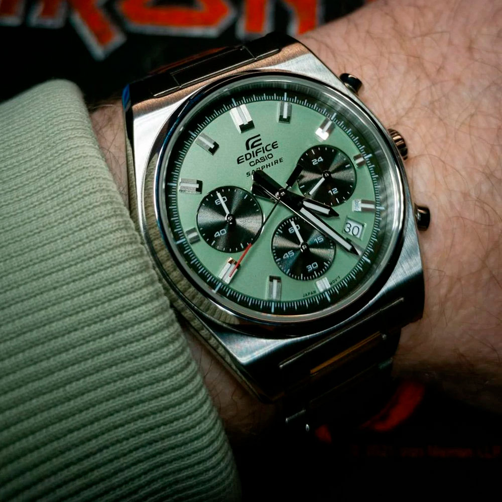 Edifice. Часы-хронограф с секундомером с точностью показаний 1с и временем измерения 1ч. 12-ти и 24-х часовой формат времени. Циферблат с метками в виде штрихов защищен прочным сапфировым стеклом. Окошко даты находится между метками 4 и 5 часов.
