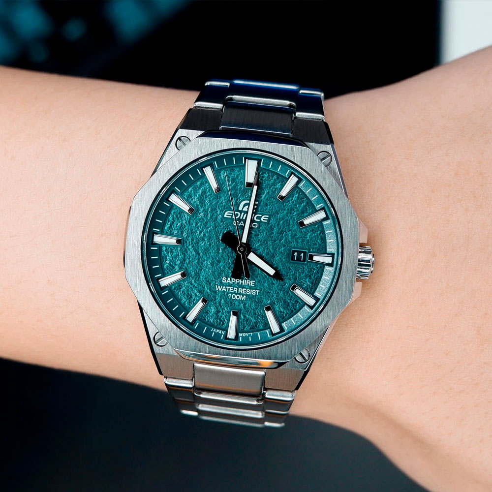 Свежий релиз 2025 года в коллекции Edifice из серии EFR-S108 — новая расцветка в стальном октагоновом корпусе с необычным фактурным циферблатом благородного изумрудного оттенка, покрытым сапфировым стеклом! Особенность модели — невероятно тонкий, по сравнению с другими часами эдифис, корпус толщиной всего в 7.8 мм. В итоге мы получили сверх-стильный лаконичный трехстрелочник с водозащитой в 10 Бар, сапфиром, необрайтовой подсветкой стрелок, отображением текущей даты и батарейкой на 3 года. Отличный стальной релиз от Casio в новом тренде Edifice к тонким лаконичным моделям со спортивным характером. Напоминаем, что серия EFR — это мидл-класс коллекции Edifice и самая многочисленная линейка эдифайсов. Модели серии EFR обладают различными расцветками и дизайнами, что позволяет выбирать их в качестве часов на каждый день сотням тысяч людей по всему миру!