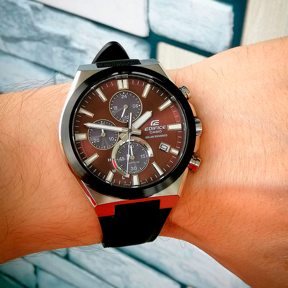 Хронограф Casio Edifice без сомнения создаст идеальный спортивный образ для любого мужчины. Edifice. Питание от солнечной энергии, индикатор уровня зарядки батареи. Время работы аккумулятора без подзарядки приблизительно 5 месяцев. Необритовое светонакопительное покрытие обеспечивает длительное послесвечение в темноте даже после кратковременного нахождения на свету. Часы-хронограф с секундомером с точностью показаний 1с и временем измерения 30мин. 12-ти и 24-х часовой формат времени. Циферблат с метками в виде штрихов. Окошко даты находится в положении 4 часа. Заводная головка с защитой. Задняя крышка с винтовым фиксатором. Ремешок с классической застежкой.
