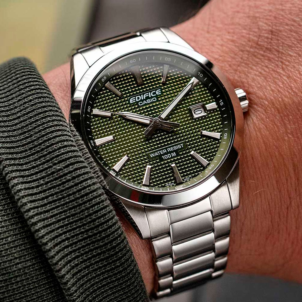 Edifice. Мужские часы. Текстурный циферблат с метками в виде штрихов украшен узором «Clous de Paris». Окошко даты находится в положении 3 часа. Задняя крышка с винтовым фиксатором. Батарейка рассчитана на 3 года. Браслет с тройной раскладывающейся застежкой, расстегиваемой одним касанием.