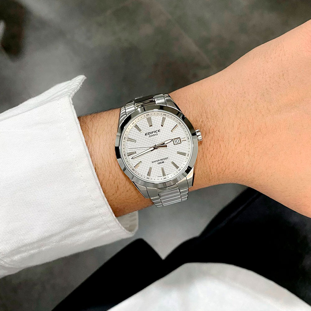 Edifice. Мужские часы. Текстурный циферблат с метками в виде штрихов украшен узором «Clous de Paris». Окошко даты находится в положении 3 часа. Задняя крышка с винтовым фиксатором. Батарейка рассчитана на 3 года. Браслет с тройной раскладывающейся застежкой, расстегиваемой одним касанием.