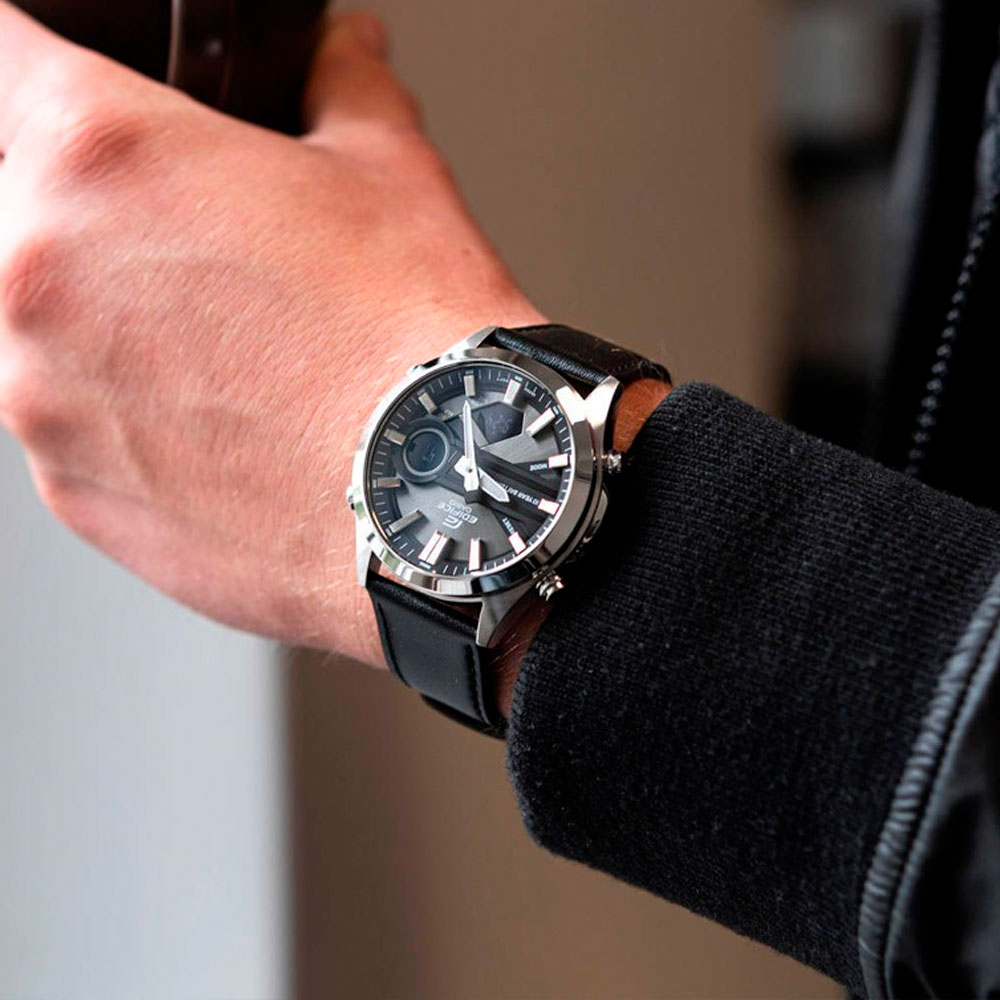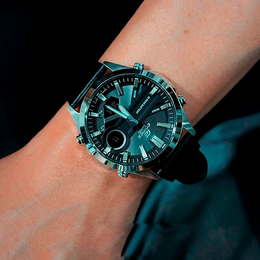 Самый практичный аксессуар, который никогда не подведет вас в вопросах времени. Edifice. Мужские часы. 12-ти и 24-х часовой формат времени. Секундомер с точностью показаний 1/100с и временем измерения 24ч. SPLIT-хронограф. Таймер обратного отсчета от 1мин до 24ч. Мировое время – 30 городов (29 часовых поясов), возможность включения/отключения летнего времени. Записная книжка на 30 ячеек памяти для записи имен и телефонных номеров, каждая запись может включать в себя текст из 8 букв и 16 цифр. Циферблат с метками в виде штрихов выполнен по технологии Sunray (солнечные лучи). Водонепроницаемость 10 Бар в соответствии с ISO 2281. Батарея рассчитана на 10 лет. Ремешок с классической застежкой.