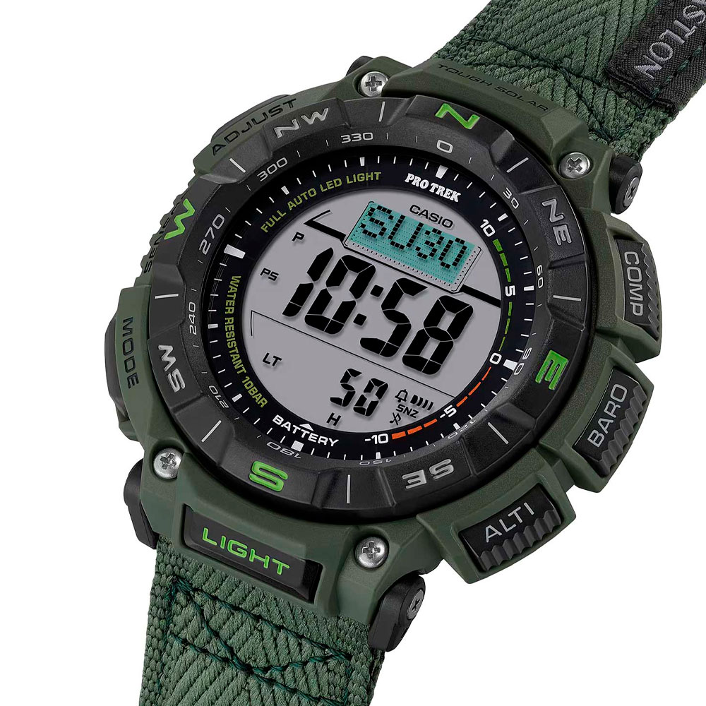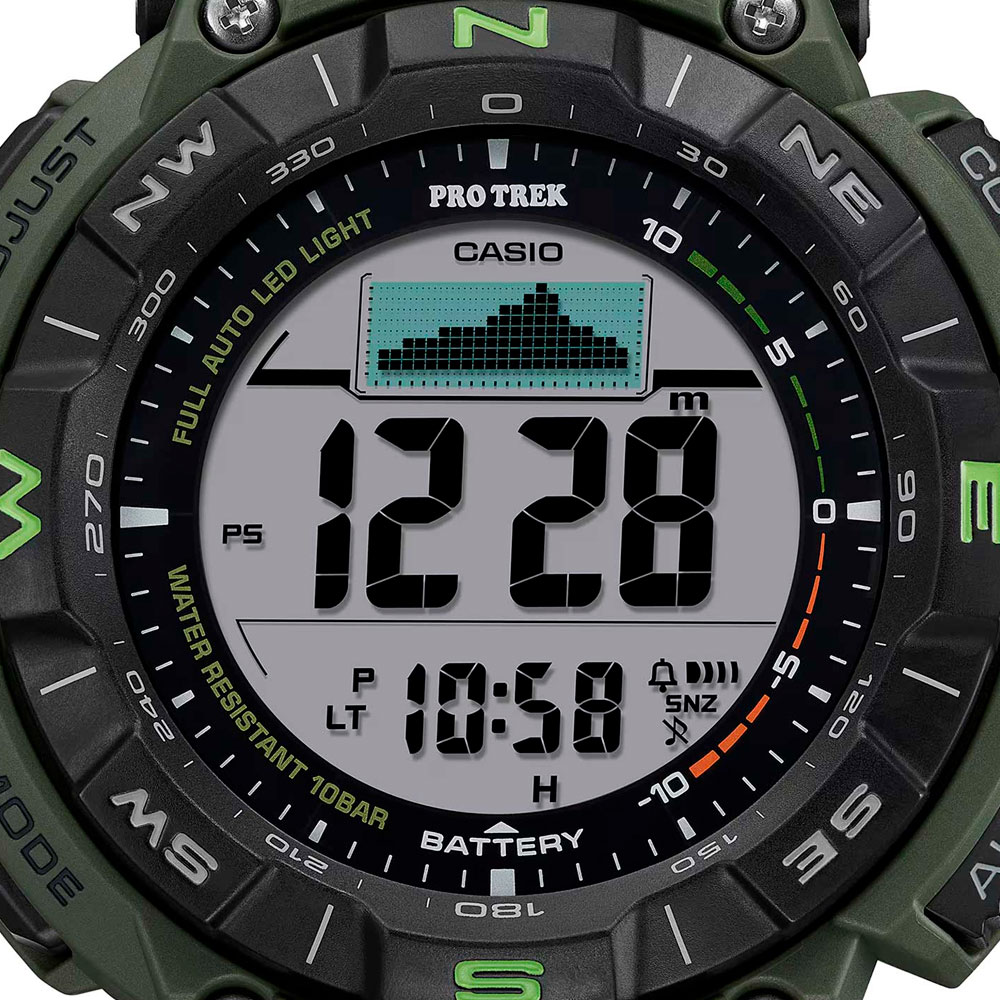 Pro Trek. Мужские часы. Корпус и задняя крышка выполнены из биопластика, который изготавливается из возобновляемых органических ресурсов. Питание от солнечной энергии Tough Solar - солнечные батарейки большой мощности, индикатор заряда батареи. Функция автоматического сохранения энергии. Время работы аккумулятора без подзарядки приблизительно 7 месяцев, при включенной функции сохранения энергии приблизительно 27 месяцев. Модуль часов рассчитан на работу при низких температурах до -10°С/14°F. Циферблат подсвечивается светодиодом. Настраиваемое послесвечение 1,5 или 3сек. Цвет подсветки: белый.