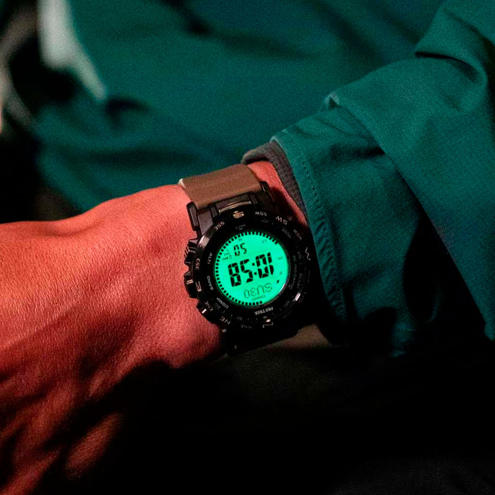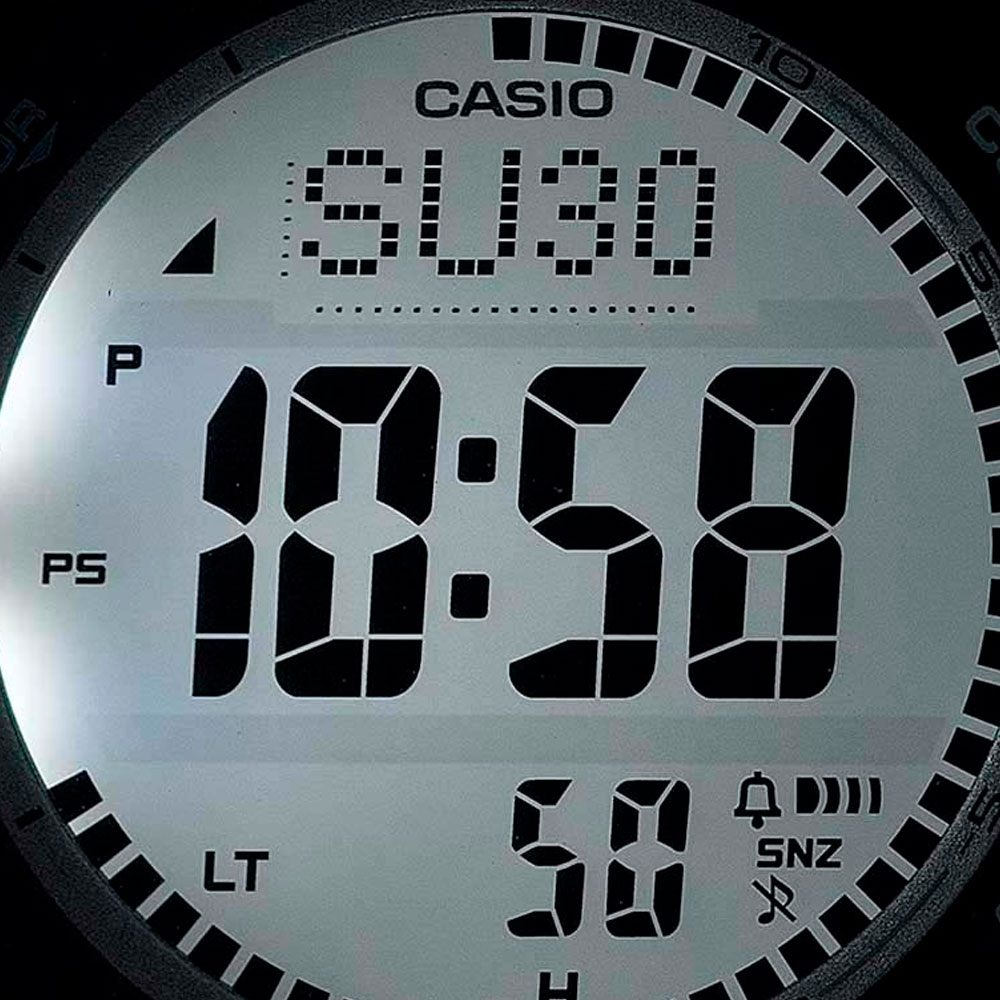 Циферблат подсвечивается ярким светодиодом, при недостаточном освещении во время поворота запястья в сторону лица подсветка включается автоматически. Настраиваемое послесвечение 1,5 или 3сек. Цвет подсветки: белый. Под цифровым дисплеем находится люминесцентный материал, который обеспечивает длительное послесвечение в темноте даже после кратковременного нахождения на свету.