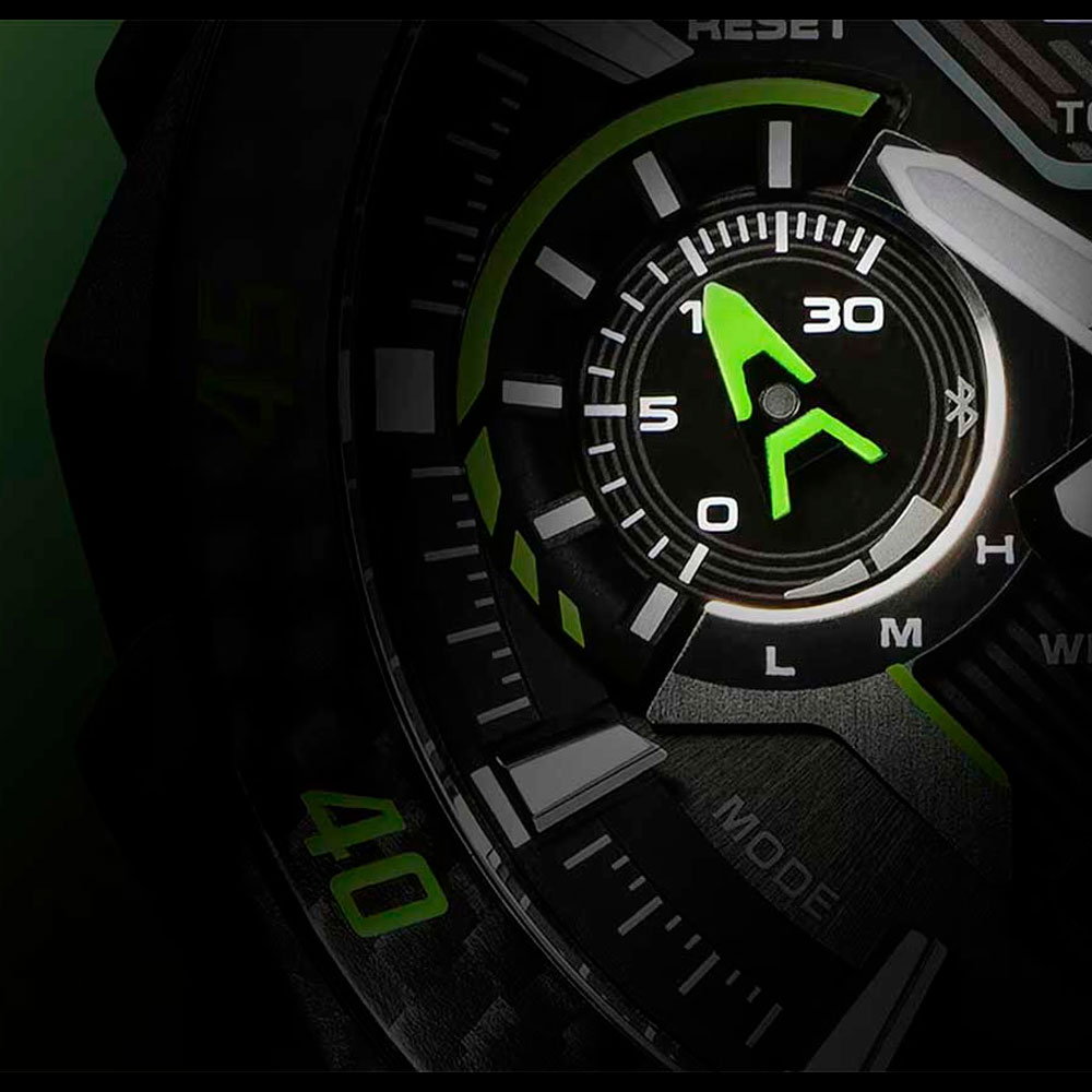 Двойная подcветка: циферблат и ЖК-дисплеи подсвечиваются светодиодом, благодаря наличию функции задержки, после отпускания кнопки освещение горит еще несколько секунд. Настраиваемое послесвечение 1,5 или 3сек. Цвет подсветки: белый. Необритовое светонакопительное покрытие обеспечивает длительное послесвечение в темноте даже после кратковременного нахождения на свету.