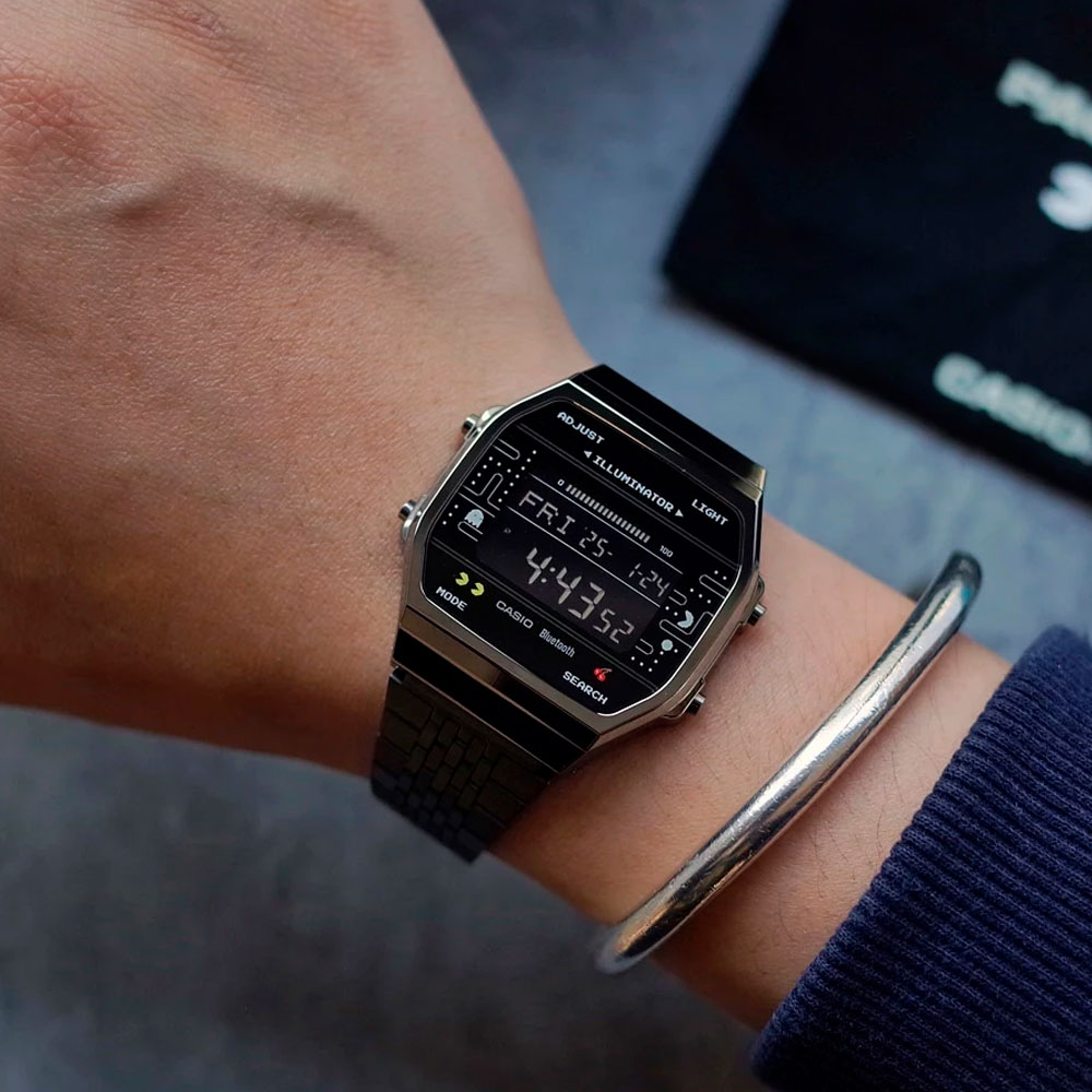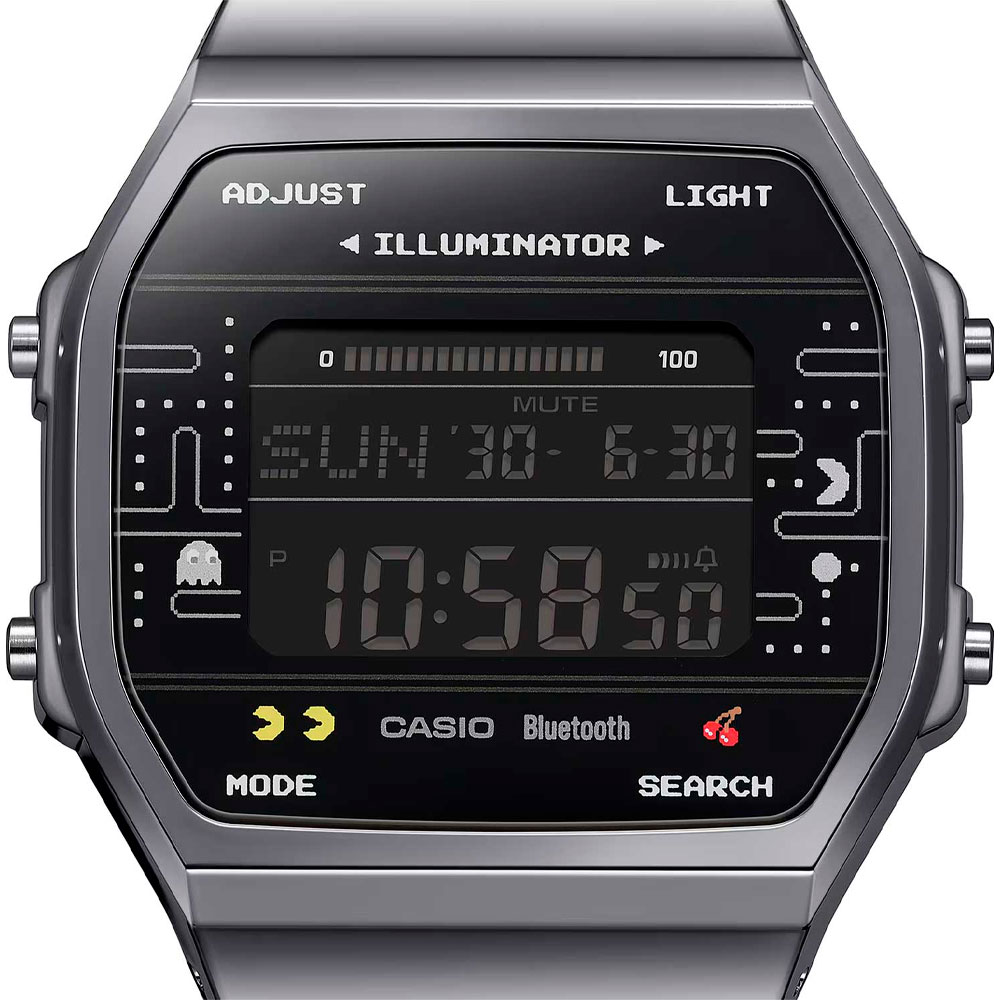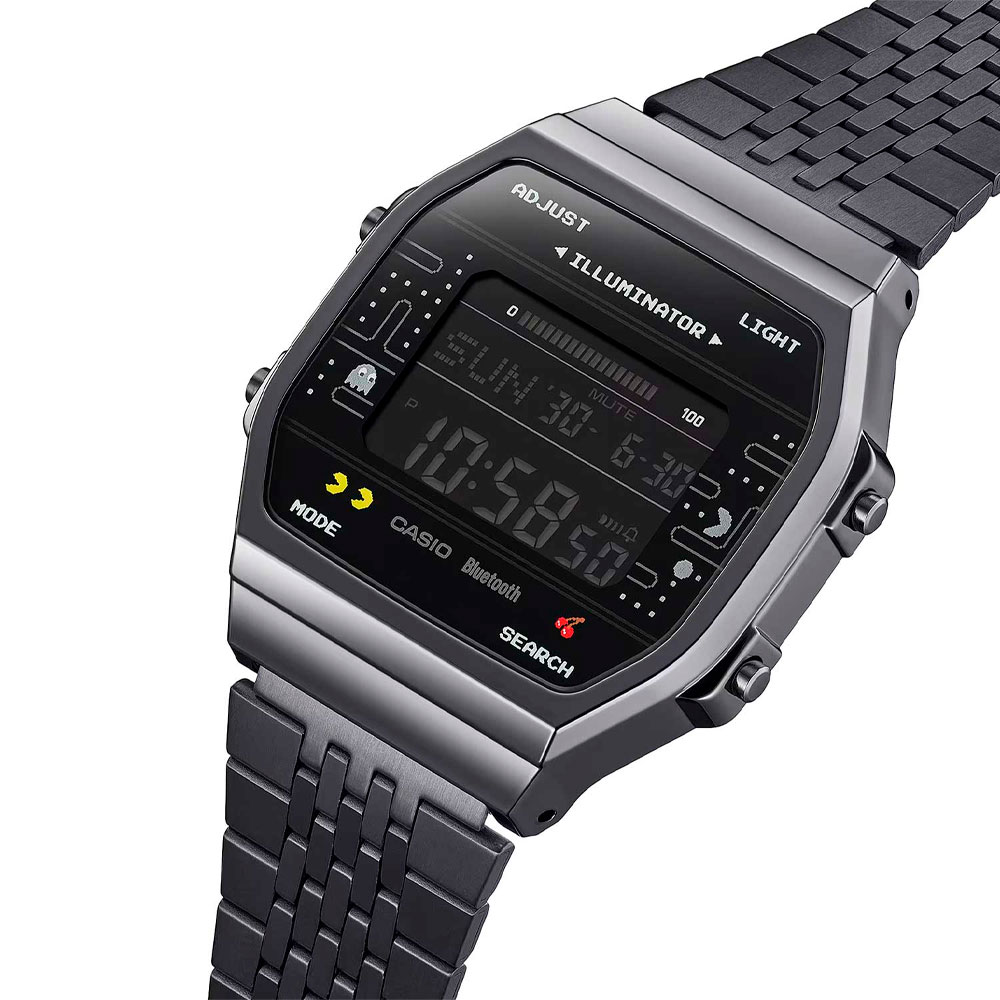 Casio Vintage x Pac Man. Унисекс часы. Модель создана в честь 45-летия игры Pac-Man, которую в 1980 году разработала и выпустила компания Bandai Namco Entertainment. Каждая деталь часов погрузит вас в ностальгию по культовой игре. Циферблат подсвечивается ярким светодиодом. Настраиваемое послесвечение 1,5 или 3сек. Цвет подсветки: оранжевый. Второй часовой пояс. 12-ти и 24-х часовой формат времени. Секундомер с двумя точностями показаний: 1/100с (до 1ч) и 1с (после 1ч) и временем измерения 24ч. Память на 200 этапов (дата, время, время круга). SPLIT-хронограф. Таймер обратного отсчета от 1сек до 1ч. Шагомер измеряет количество шагов от 0 до 999999. Установка цели в диапазоне от 1000 до 50000 шагов. Звуковое напоминание об отсутствии активности и достижении цели. Отображение пройденных шагов за последние 7ч на 6-ти уровневом графике.