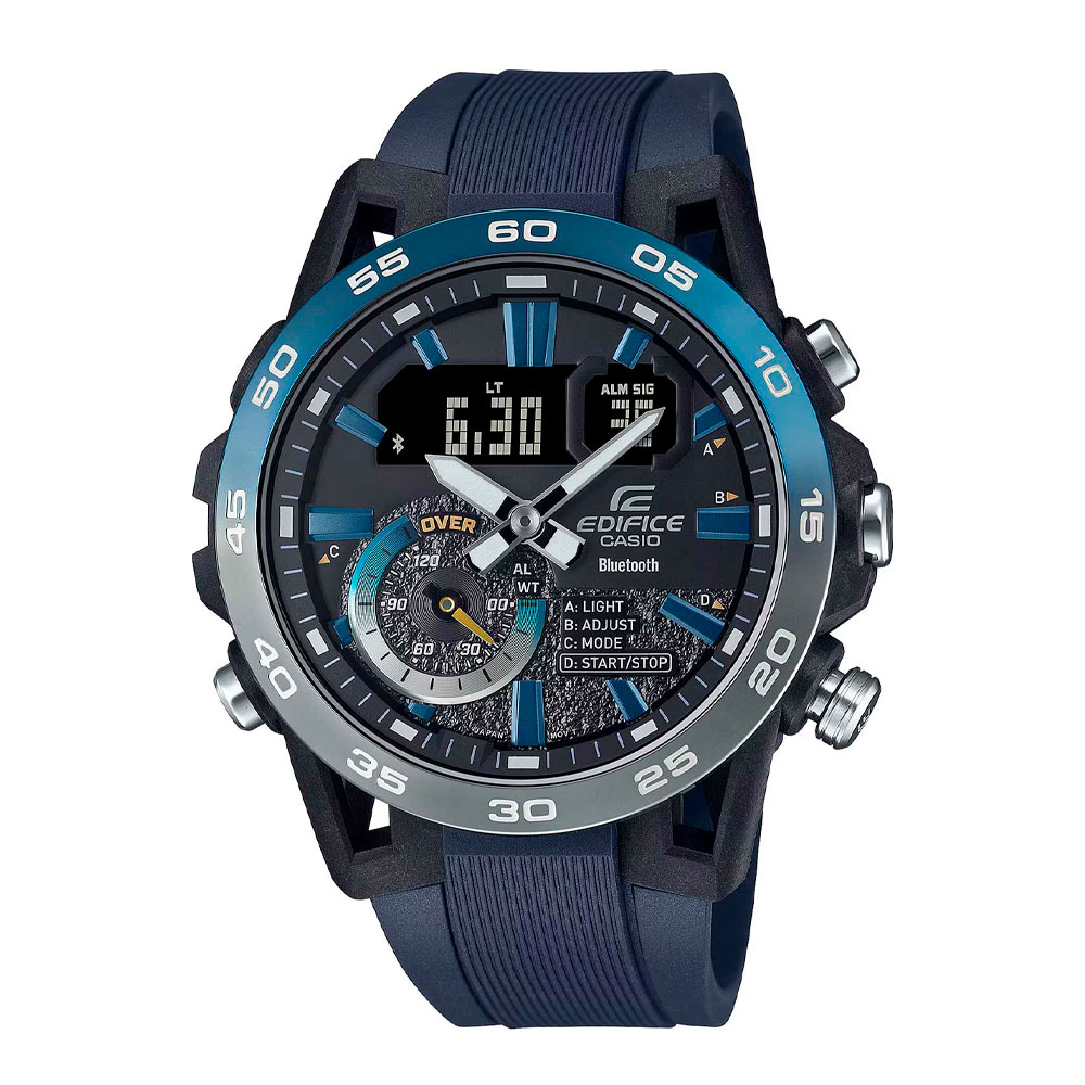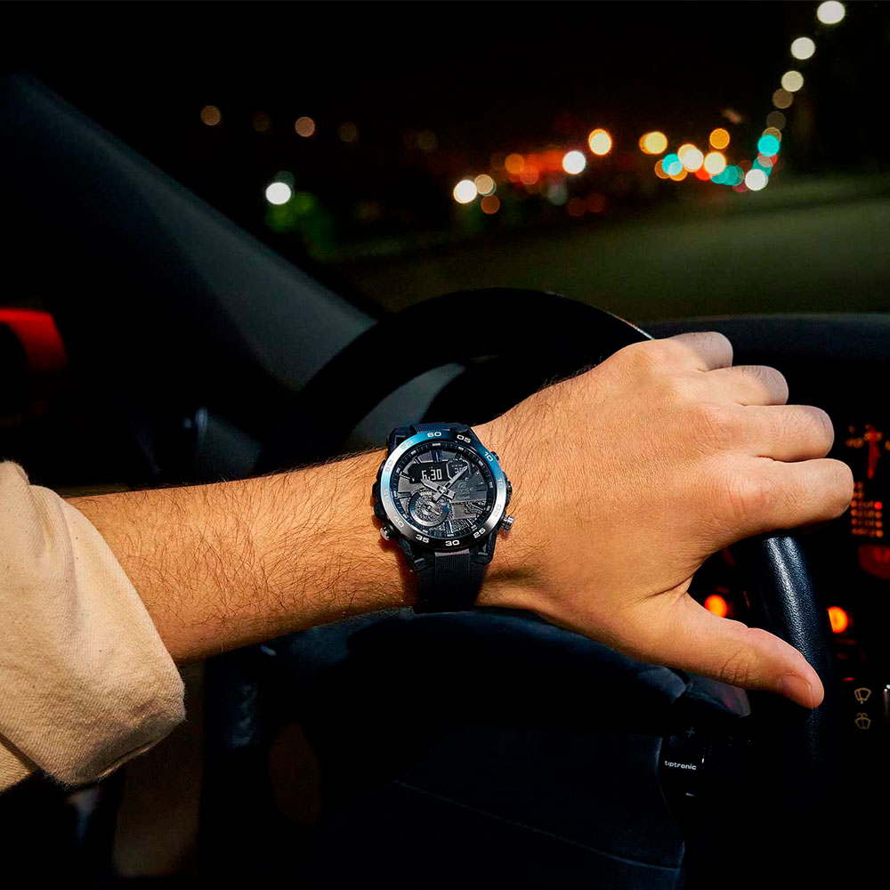 Стильная и функциональная новинка в линейке Edifice пронизана насквозь спортом и духом скорости. Edifice Sospensione Nighttime Drive. Мужские часы, дизайн которых вдохновлен подвеской болида Формулы-1. Ушки часов разработаны по схеме четырехрычажной подвески гоночного автомобиля. Цветовая гамма вдохновлена сиянием фар и уличных фонарей, которая прорезает синеву ночного неба. Двойная подcветка: циферблат и ЖК-дисплеи подсвечиваются светодиодом, благодаря наличию функции задержки, после отпускания кнопки освещение горит еще несколько секунд. При повороте часов в сторону лица, подсветка включается автоматически. Настраиваемое послесвечение 1,5 или 3сек. Цвет подсветки: белый. Необритовое светонакопительное покрытие обеспечивает длительное послесвечение в темноте даже после кратковременного нахождения на свету. 12-ти и 24-х часовой формат времени. Секундомер с двумя точностями показаний: 1/1000с (до 1ч) и 1/10с (после 1ч) и временем измерения 24ч. SPLIT-хронограф. Память на 200 кругов. Таймер обратного отсчета от 1с до 24ч. Мировое время – 38 городов (38 часовых поясов), всемирное координированное время (UTC). Автоматический переход на зимнее и летнее время, возможность включения/отключения данной функции. Переключение между домашним и мировым временем. Беспроводная технология Bluetooth® со сверхнизким потреблением энергии для синхронизации со смартфоном. При подключении к смартфону часы корректируют текущее время, позволяют настроить будильник или таймер, а также копируют настройки мирового времени (до 300 городов). Авиарежим. Отображение дней недели на шести языках. Смена отображения даты/месяца. Функции перемещения стрелок, поиска телефона и включения/отключения звука. Включение/выключение звукового сигнала по расписанию. Батарейка рассчитана на 2 года. Стальная задняя крышка крепится на 4-х винтах.