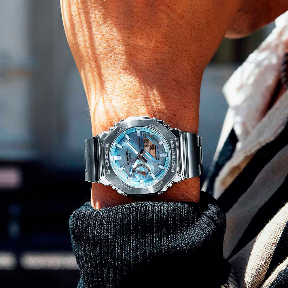 Классические G-Shock на стальном браслете - идеальный вариант на все случаи жизни! G-Shock. Мужские часы. Противоударный корпус защищает механизм от ударов и вибрации. Двойная подcветка: циферблат и ЖК-дисплеи подсвечиваются светодиодом, благодаря наличию функции задержки, после отпускания кнопки освещение горит еще несколько секунд. Настраиваемое послесвечение 1,5 или 3сек. Цвет подсветки: белый. Необритовое светонакопительное покрытие обеспечивает длительное послесвечение в темноте даже после кратковременного нахождения на свету. 12-ти и 24-х часовой формат времени. Секундомер с двумя точностями показаний: 1/100с (до 1ч) и 1с (после 1ч) и временем измерения 24ч. SPLIT-хронограф. Таймер обратного отсчета от 1c до 24ч. Мировое время – 48 городов (31 часовой пояс), всемирное координированное время (UTC). Функция включения/отключения летнего времени. Ретроградный указатель для недели. Функции отключения/включения звука и перемещения стрелок для беспрепятственного просмотра информации на цифровых дисплеях. Циферблат с метками в виде штрихов выполнен по технологии Sunray (солнечные лучи). Батарея рассчитана на 3 года. Стальная задняя крышка крепится на 4-х винтах. Браслет с тройной раскладывающейся застежкой, расстегиваемой одним касанием.